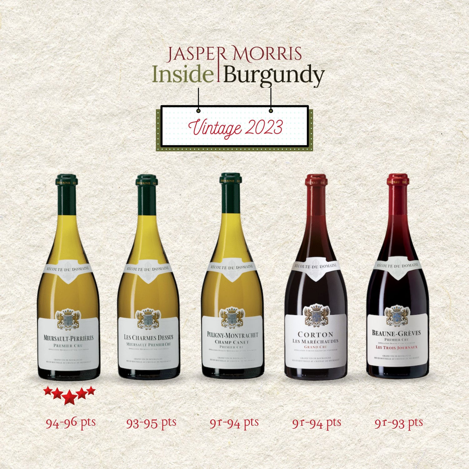 Meursault Perrières 1er Cru - 5 stars wine. "Many layers waiting to unfold, very gorgeous. Wonderful finish, the stones adding pinpoint precision to the weight of orchard fruit." - 94-96pts